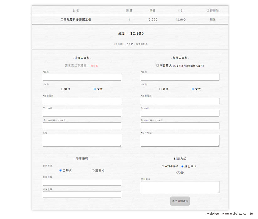 使用商品導覽頁,使瀏覽者可依指引方式找尋適合的商品。因應電商時代趨勢,另在網站上架設附有金流的購物車,順應消費者之購物習慣。