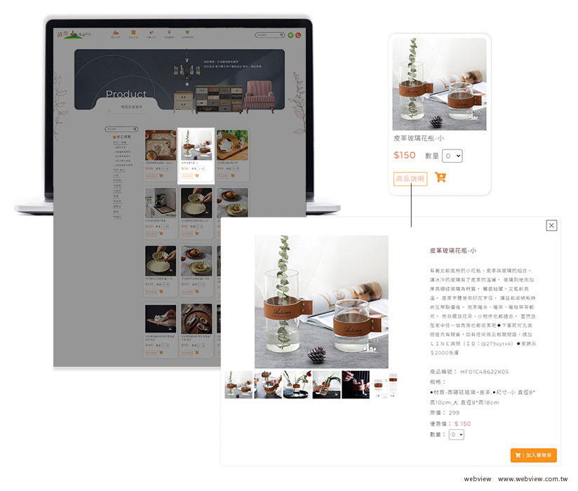 使用商品導覽頁,使瀏覽者可依指引方式找尋適合的商品。因應電商時代趨勢,另在網站上架設附有金流的購物車,順應消費者之購物習慣。
